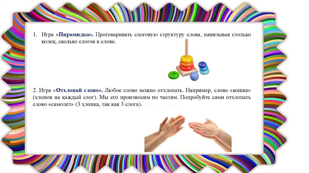 1. Игра «Пирамидка». Проговаривать слоговую структуру слова, нанизывая столькоколец, сколько слогов в слове.