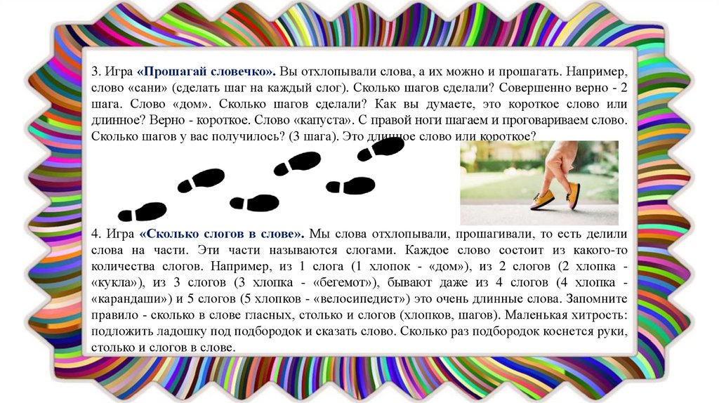 4. Игра «Сколько слогов в слове». Мы слова отхлопывали, прошагивали, то есть делили