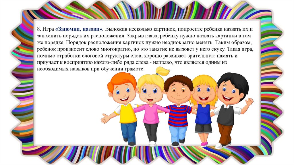 8. Игра «Запомни, назови». Выложив несколько картинок, попросите ребенка назвать их изапомнить порядок их расположения. Закрыв глаза, ребенку нужно назвать картинки в том