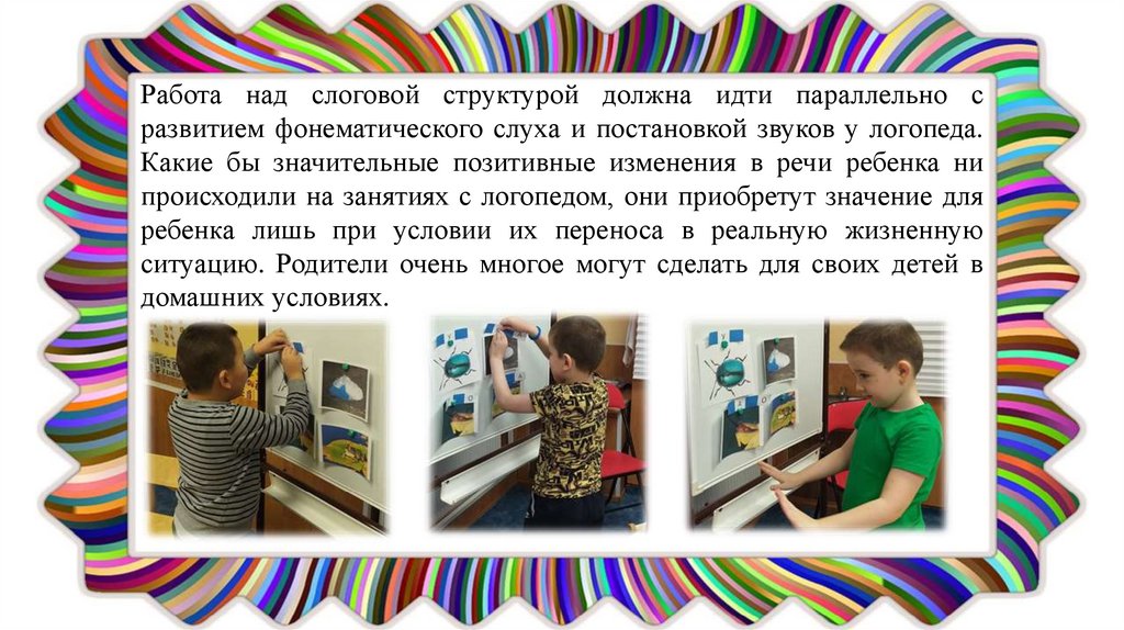 Работа над слоговой структурой должна идти параллельно сразвитием фонематического слуха и постановкой звуков у логопеда.