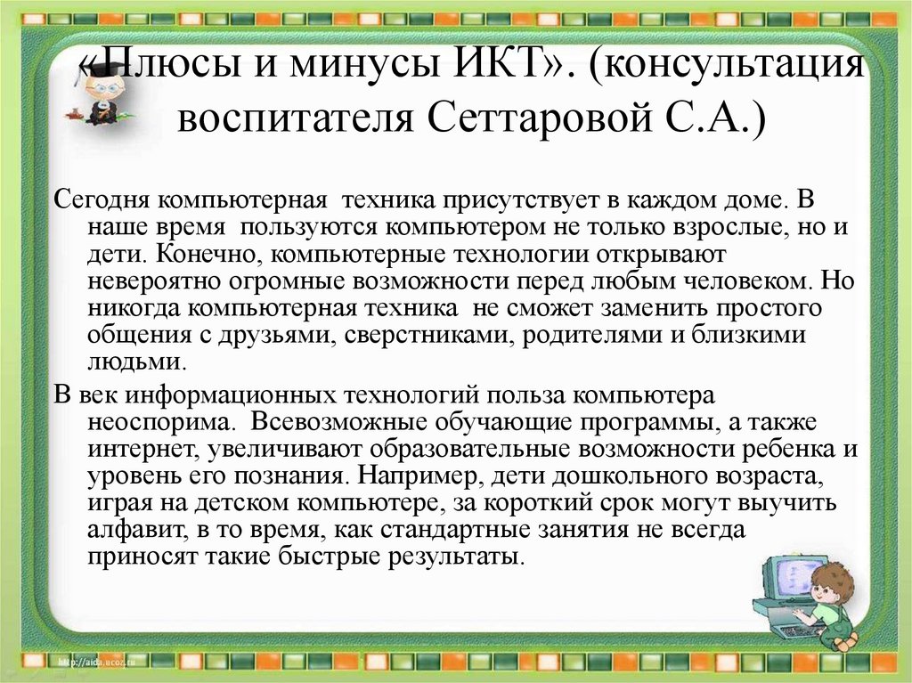 «Плюсы и минусы ИКТ». (консультациявоспитателя Сеттаровой С.А.)