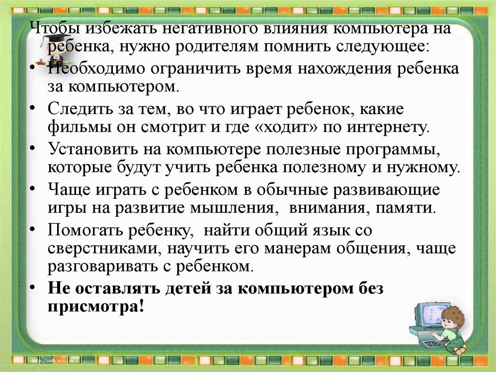 Чтобы избежать негативного влияния компьютера наребенка, нужно родителям помнить следующее: