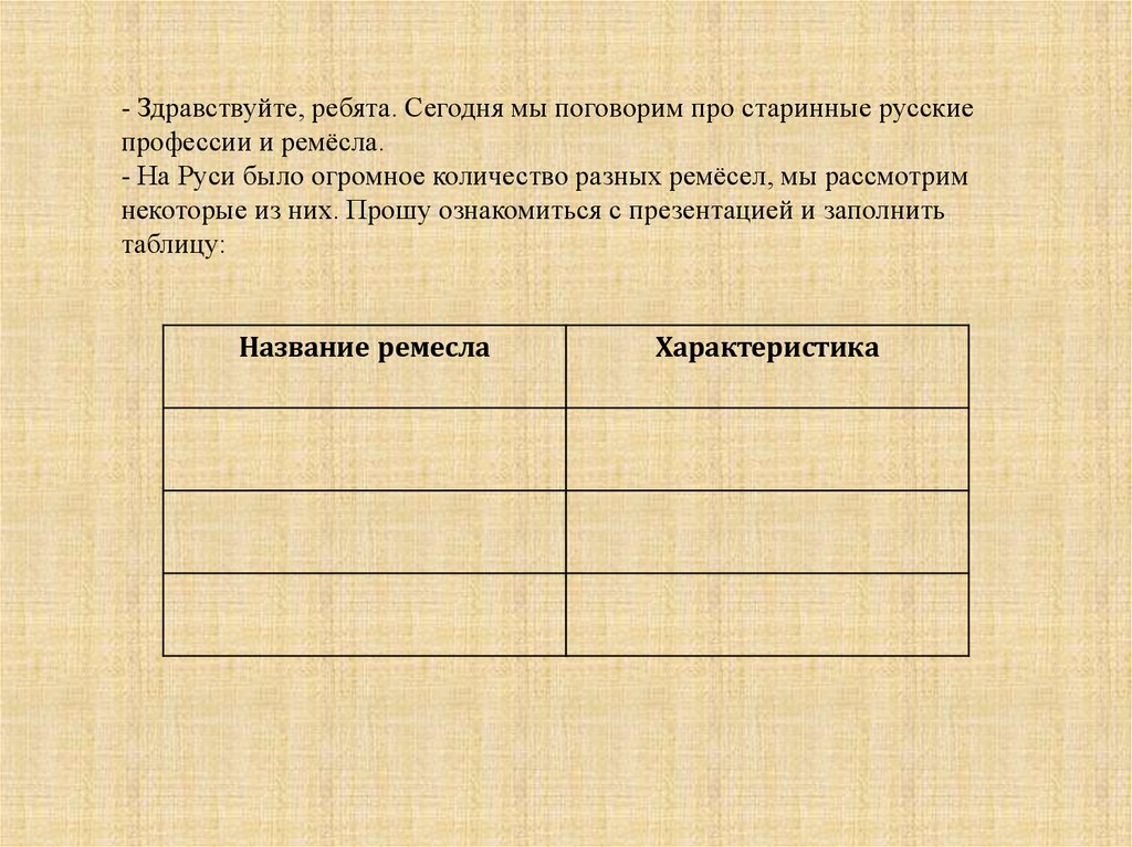 - Здравствуйте, ребята. Сегодня мы поговорим про старинные русскиепрофессии и ремёсла.