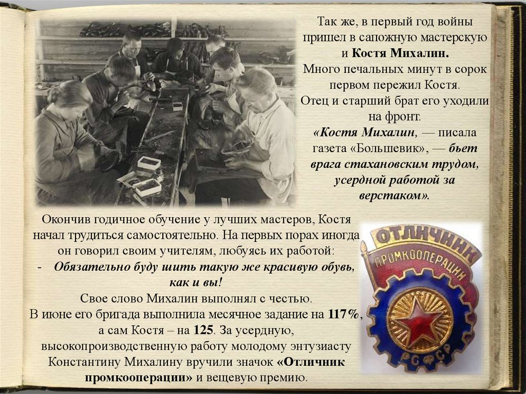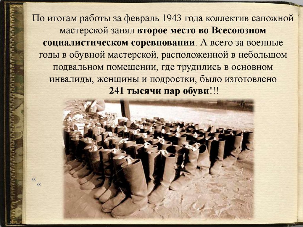 По итогам работы за февраль 1943 года коллектив сапожноймастерской занял второе место во Всесоюзном