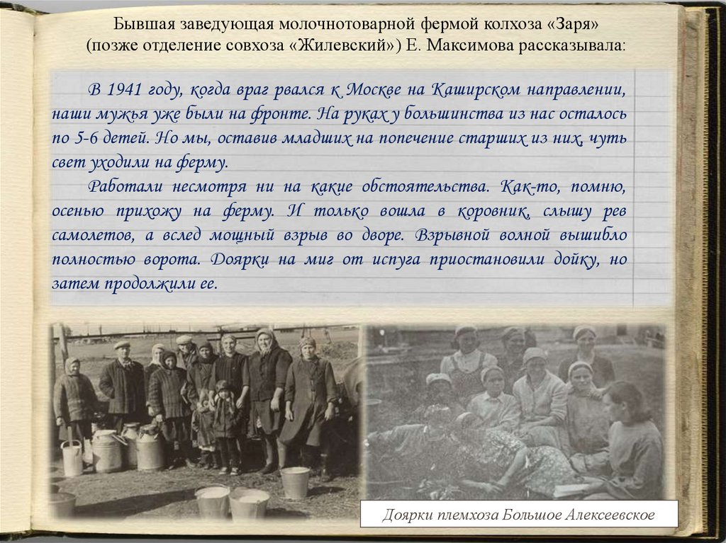 Бывшая заведующая молочнотоварной фермой колхоза «Заря»(позже отделение совхоза «Жилевский») Е. Максимова рассказывала: