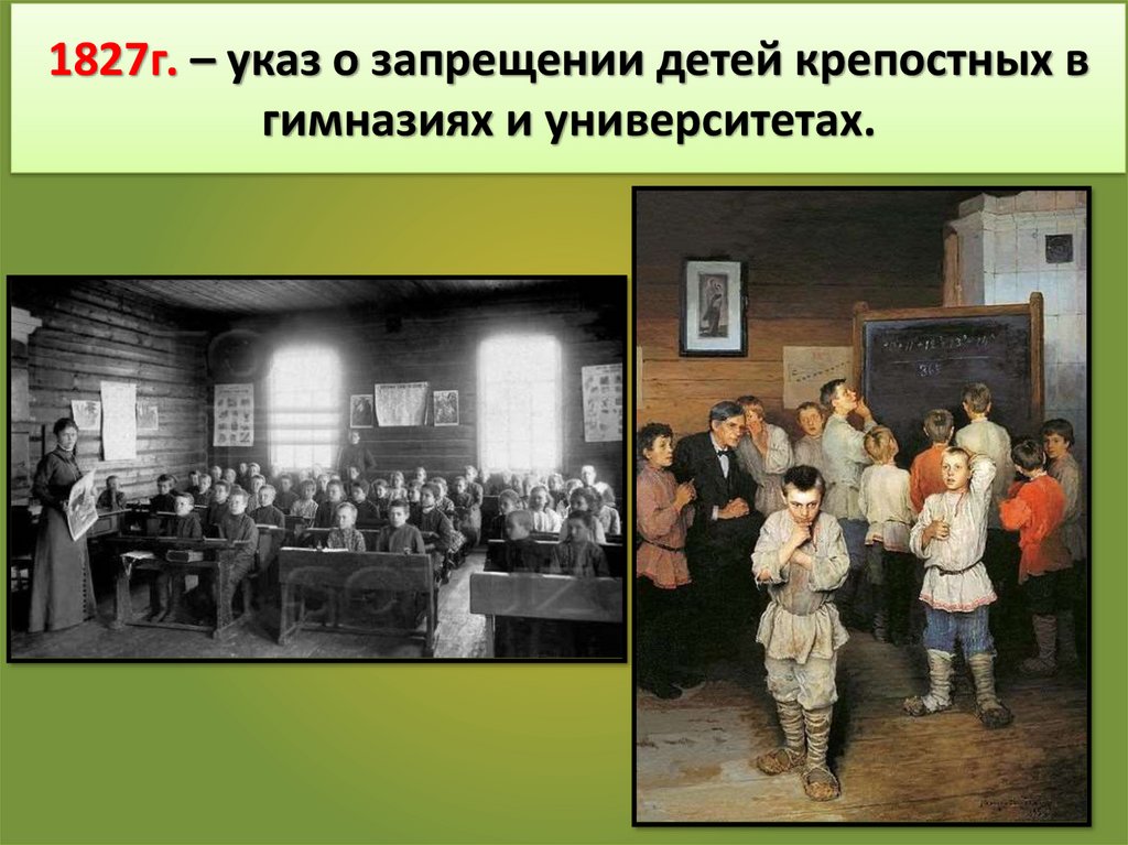 1827г. – указ о запрещении детей крепостных вгимназиях и университетах.