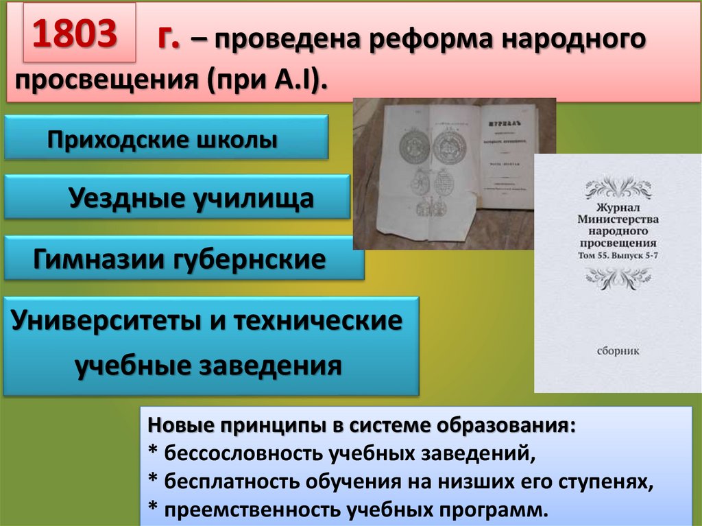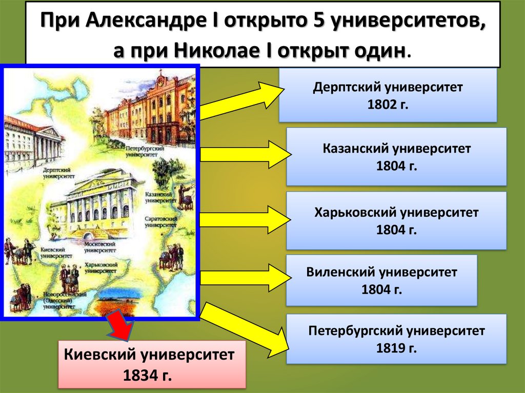 При Александре I открыто 5 университетов,а при Николае I открыт один.
