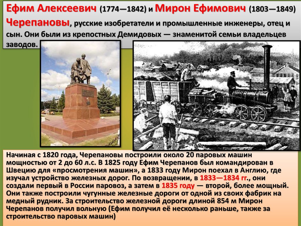 Ефим Алексеевич (1774—1842) и Мирон Ефимович (1803—1849)Черепановы, русские изобретатели и промышленные инженеры, отец и