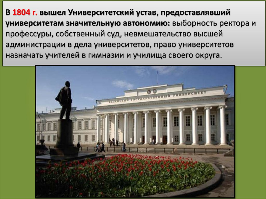 В 1804 г. вышел Университетский устав, предоставлявшийуниверситетам значительную автономию: выборность ректора и