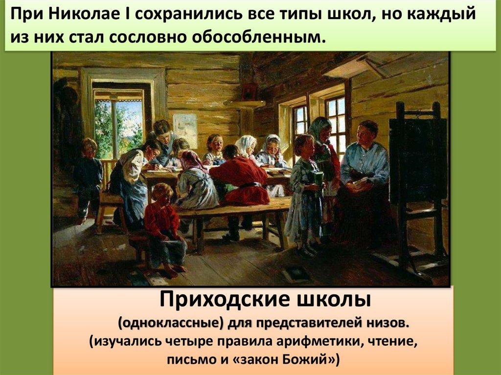 При Николае I сохранились все типы школ, но каждыйиз них стал сословно обособленным.