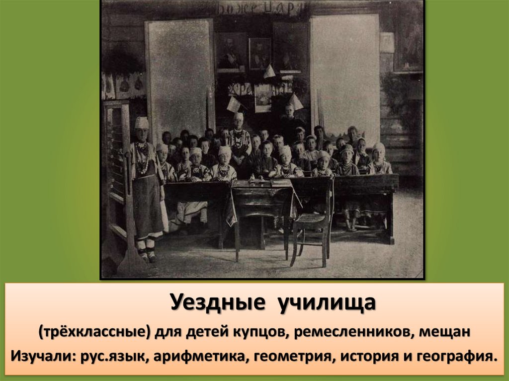 Уездные училища(трёхклассные) для детей купцов, ремесленников, мещан