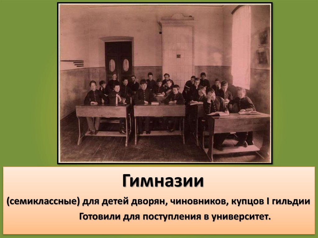Гимназии(семиклассные) для детей дворян, чиновников, купцов I гильдии