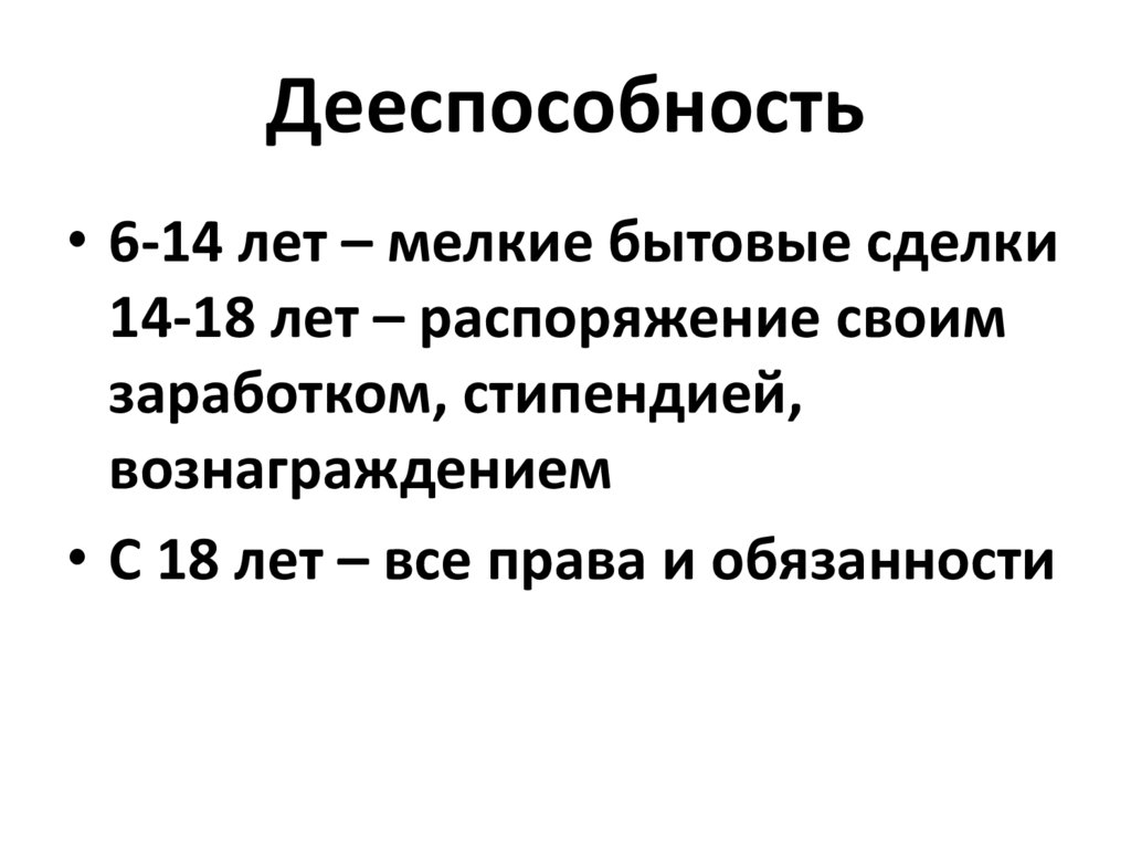 Дееспособность• 6-14 лет – мелкие бытовые сделки
