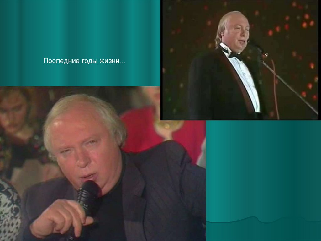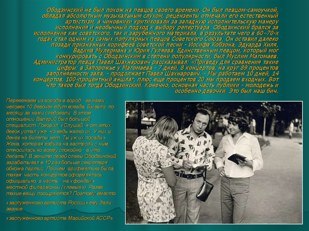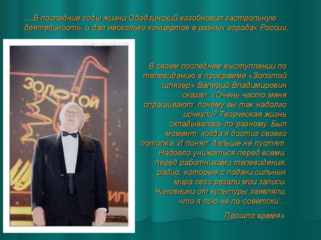 ....В последние годы жизни Ободзинский возобновил гастрольнуюдеятельность, и дал несколько концертов в разных городах России.