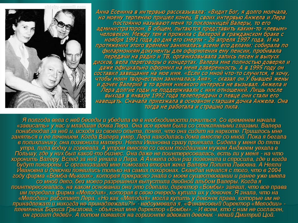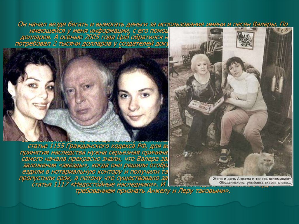Он начал везде бегать и вымогать деньги за использование имени и песен Валеры. Поимеющейся у меня информации, с его помощью девочки получили по 13 тысяч
