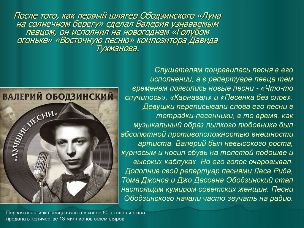 После того, как первый шлягер Ободзинского «Лунана солнечном берегу» сделал Валерия узнаваемым