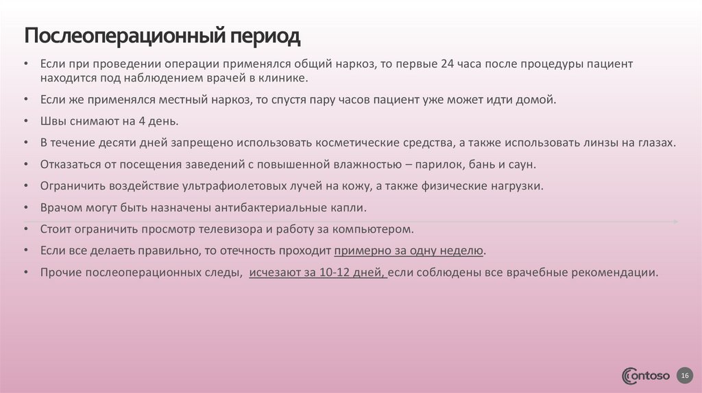 Послеоперационный период• Если при проведении операции применялся общий наркоз, то первые 24 часа после процедуры пациент