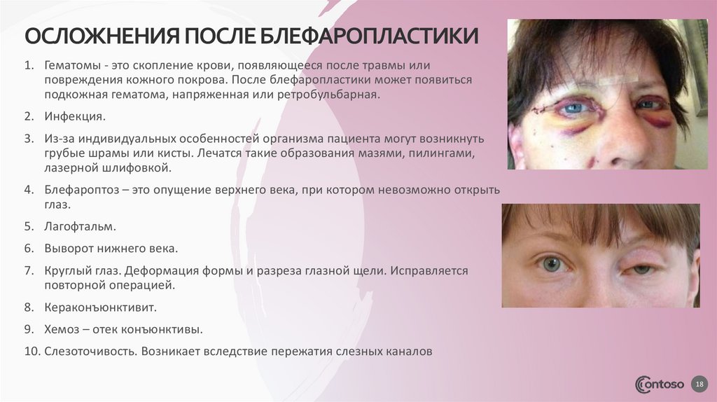 ОСЛОЖНЕНИЯ ПОСЛЕ БЛЕФАРОПЛАСТИКИ1. Гематомы - это скопление крови, появляющееся после травмы или