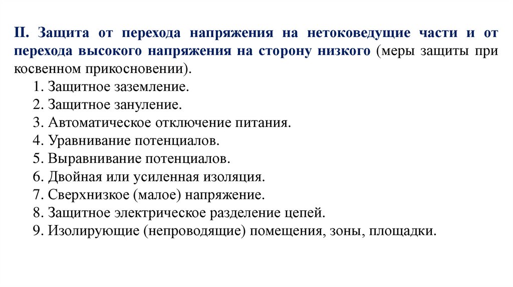 II. Защита от перехода напряжения на нетоковедущие части и отперехода высокого напряжения на сторону низкого (меры защиты при