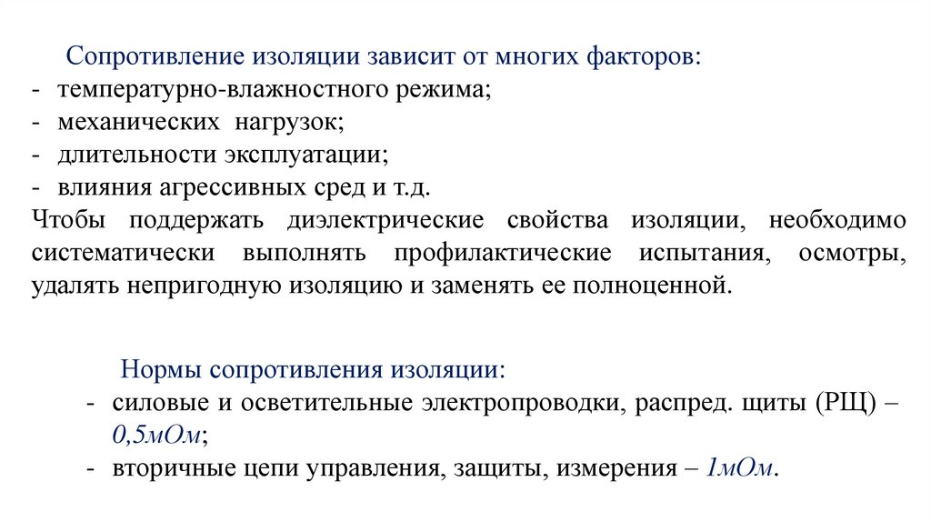 Сопротивление изоляции зависит от многих факторов:- температурно-влажностного режима;