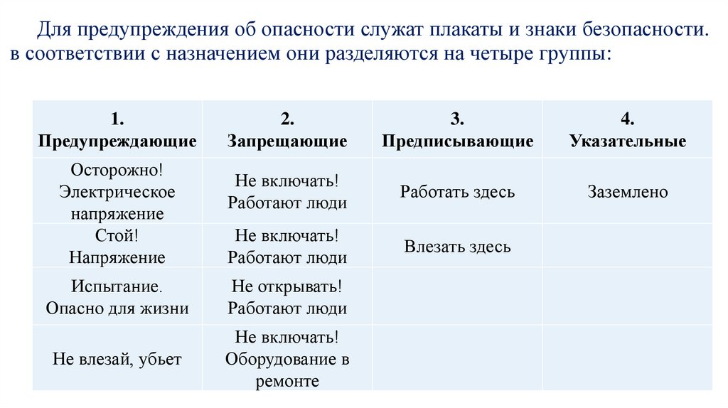 предохранительные пояса, каски, плакаты, знаки и т.п.).