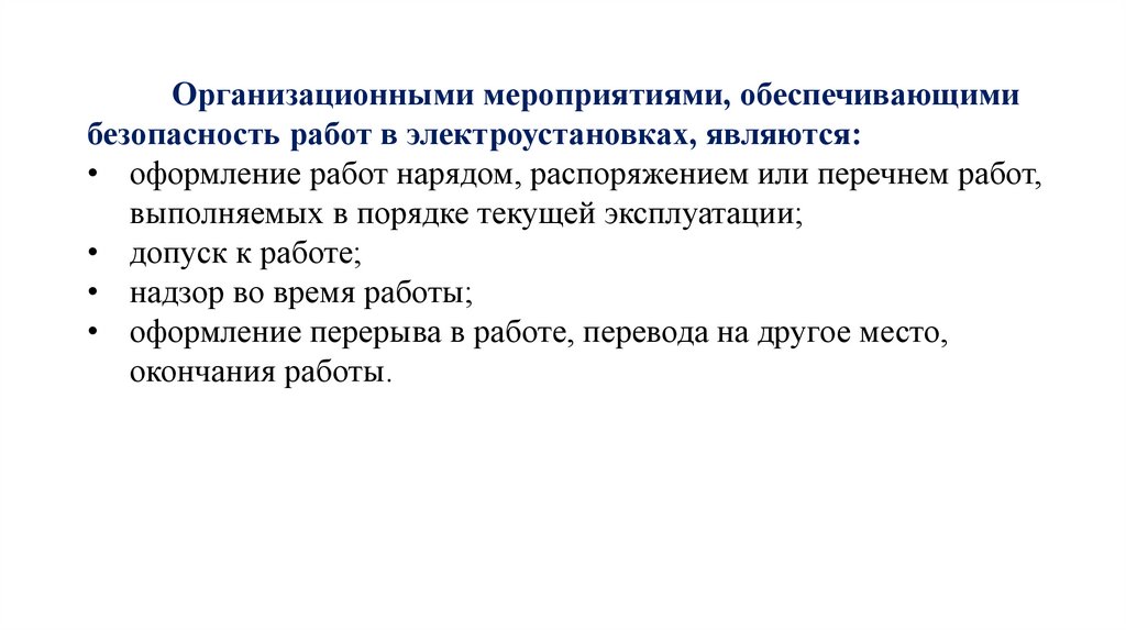 • оформление работ нарядом, распоряжением или перечнем работ,
