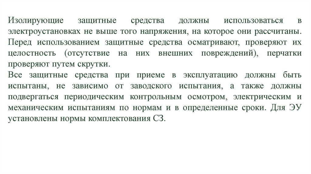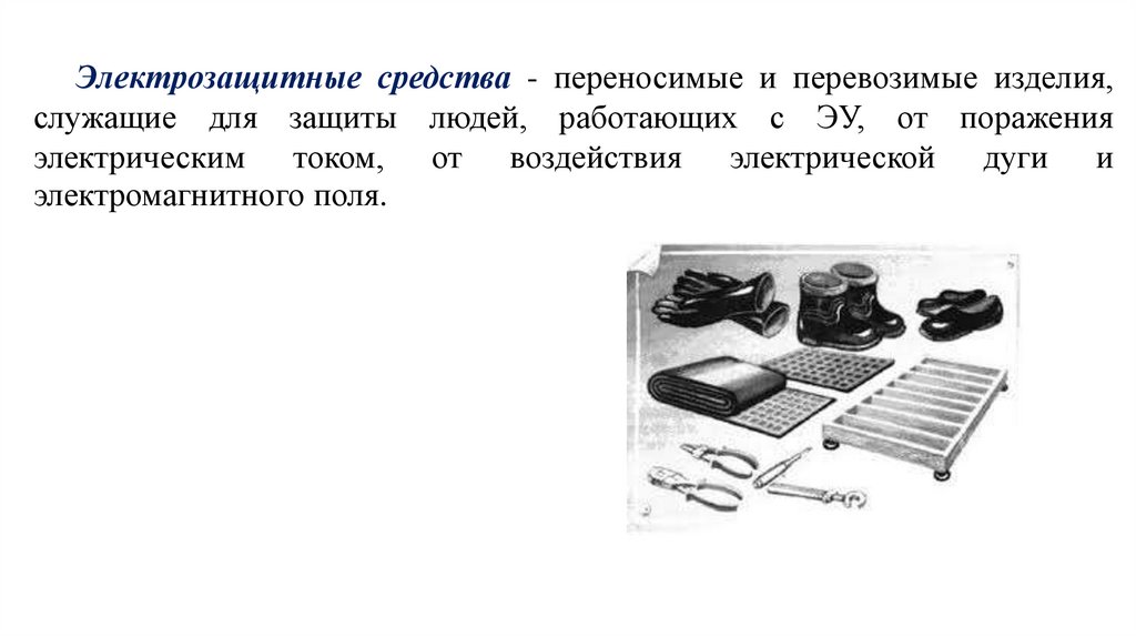 Электрозащитные средства - переносимые и перевозимые изделия,служащие для защиты людей, работающих с ЭУ, от поражения