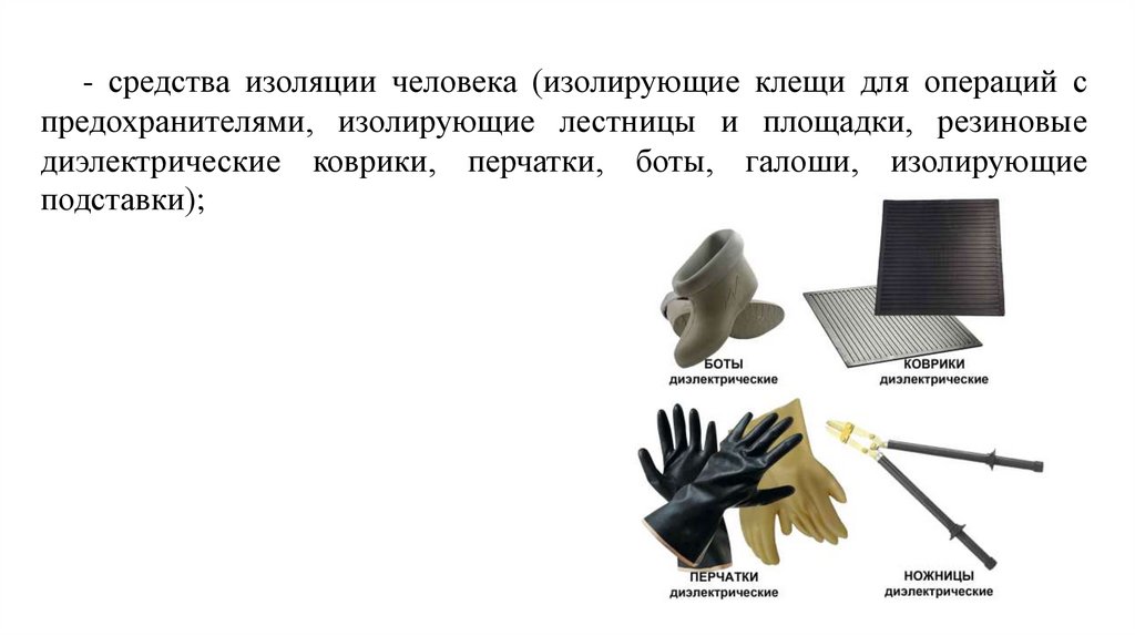 - средства изоляции человека (изолирующие клещи для операций спредохранителями, изолирующие лестницы и площадки, резиновые