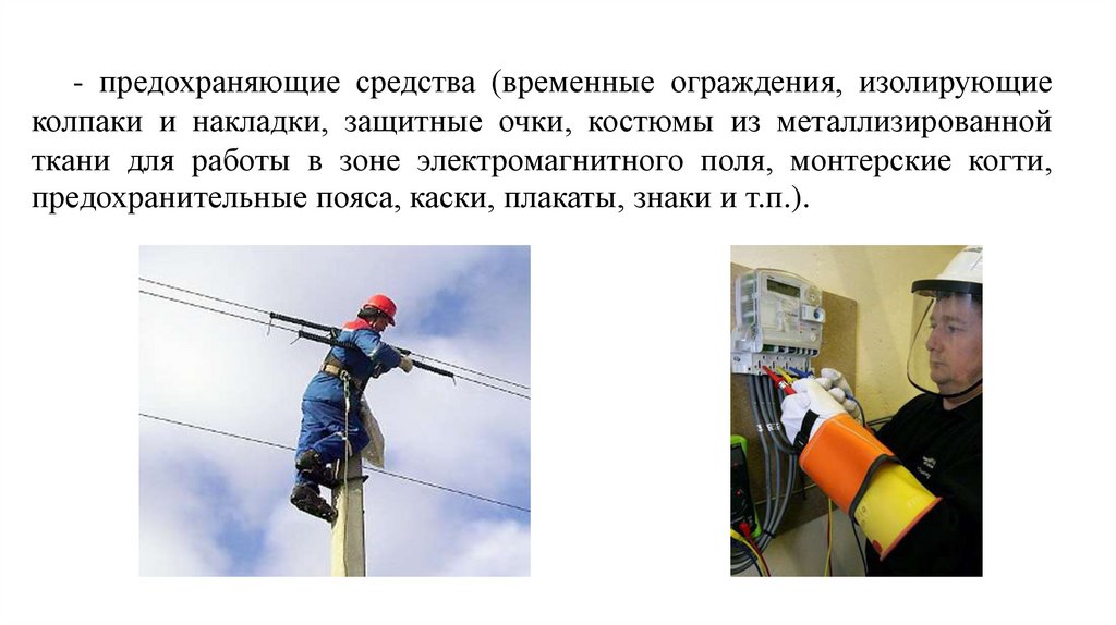 - предохраняющие средства (временные ограждения, изолирующиеколпаки и накладки, защитные очки, костюмы из металлизированной
