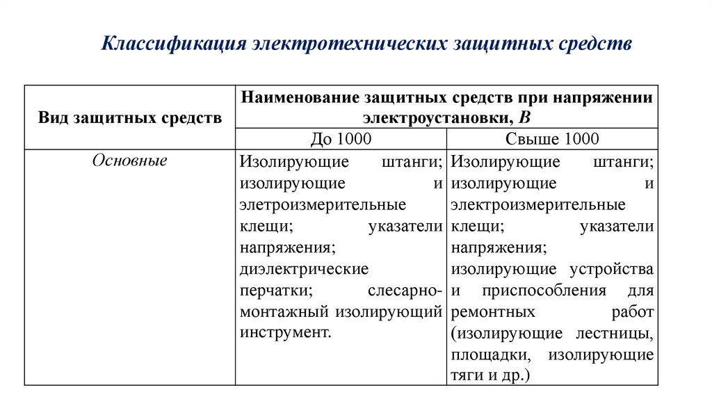 Классификация электротехнических защитных средствНаименование защитных средств при напряжении