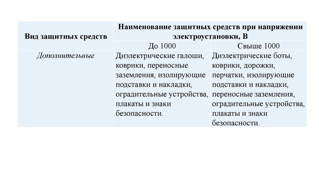 Дополнительными называются такие защитные средства, которыесами по себе не могут при данном напряжении обеспечить защиту от