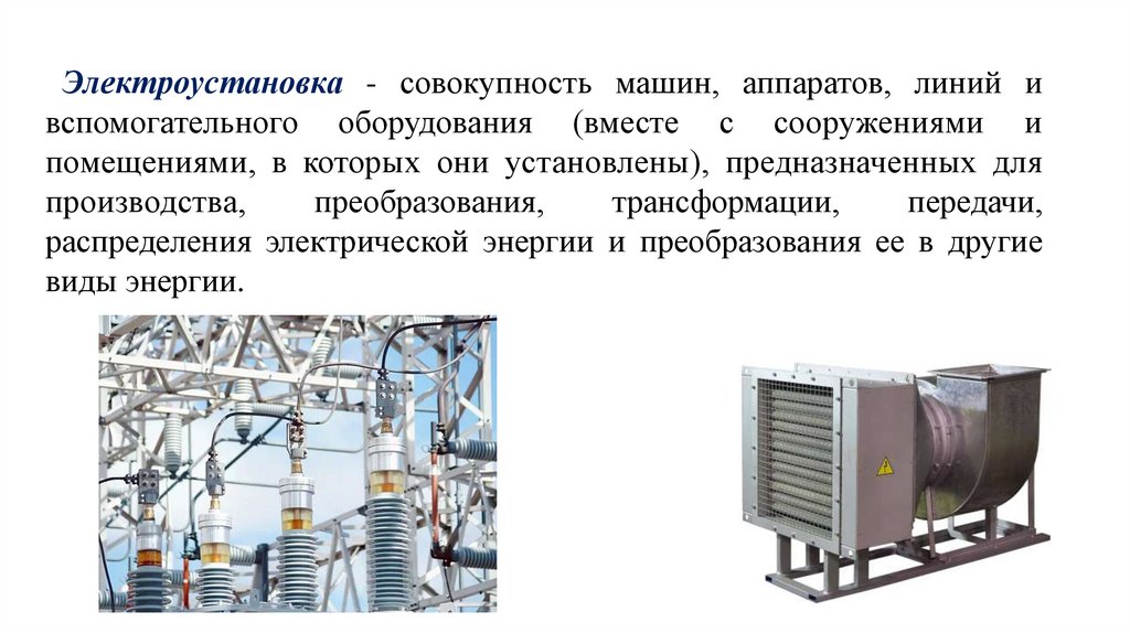 Электроустановка - совокупность машин, аппаратов, линий ивспомогательного оборудования (вместе с сооружениями и