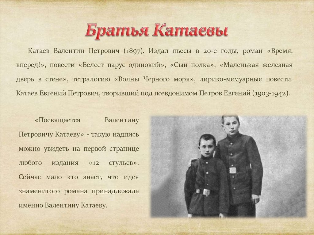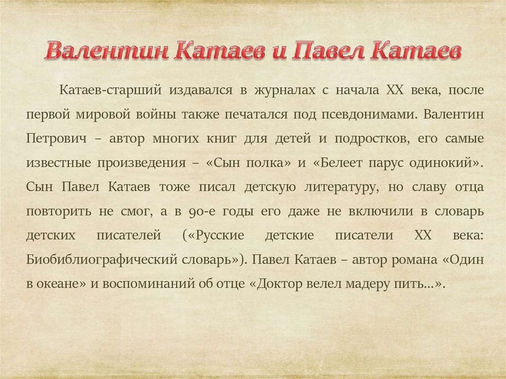 Катаев Валентин Петрович (1897). Издал пьесы в 20-е годы, роман «Время,вперед!», повести «Белеет парус одинокий», «Сын полка», «Маленькая железная