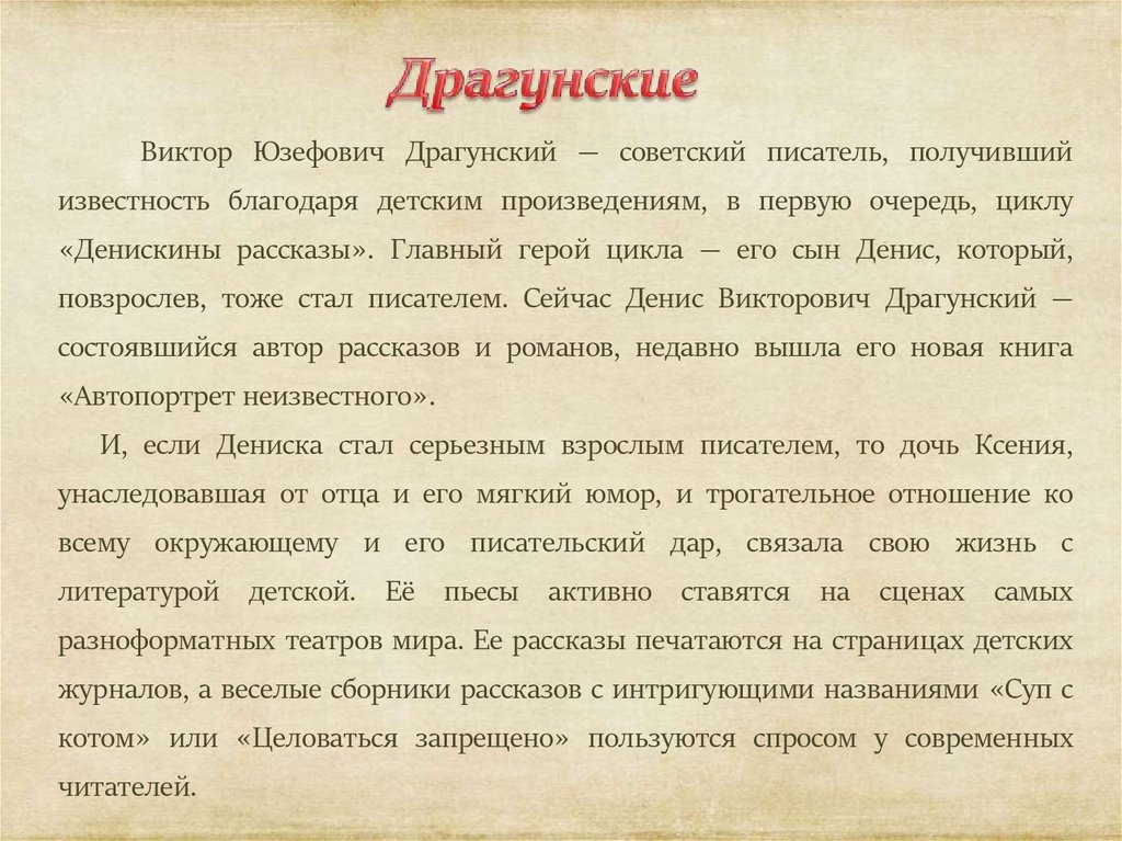 повзрослев, тоже стал писателем. Сейчас Денис Викторович Драгунский —