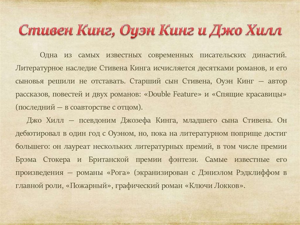 Одна из самых известных современных писательских династий.Литературное наследие Стивена Кинга исчисляется десятками романов, и его