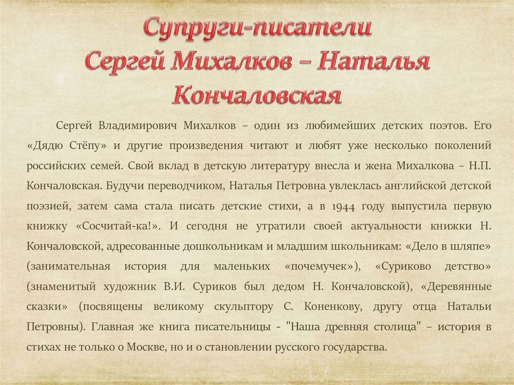 российских семей. Свой вклад в детскую литературу внесла и жена Михалкова – Н.П.