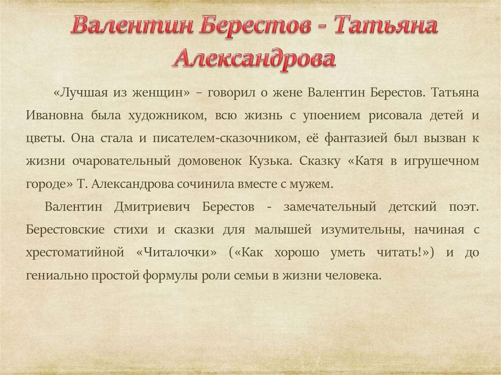 «Лучшая из женщин» – говорил о жене Валентин Берестов. ТатьянаИвановна была художником, всю жизнь с упоением рисовала детей и