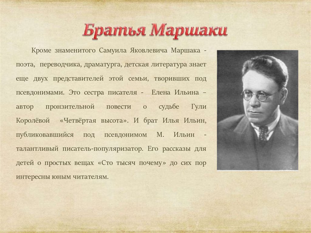 Кроме знаменитого Самуила Яковлевича Маршака поэта, переводчика, драматурга, детская литература знаетеще двух представителей этой семьи, творивших под