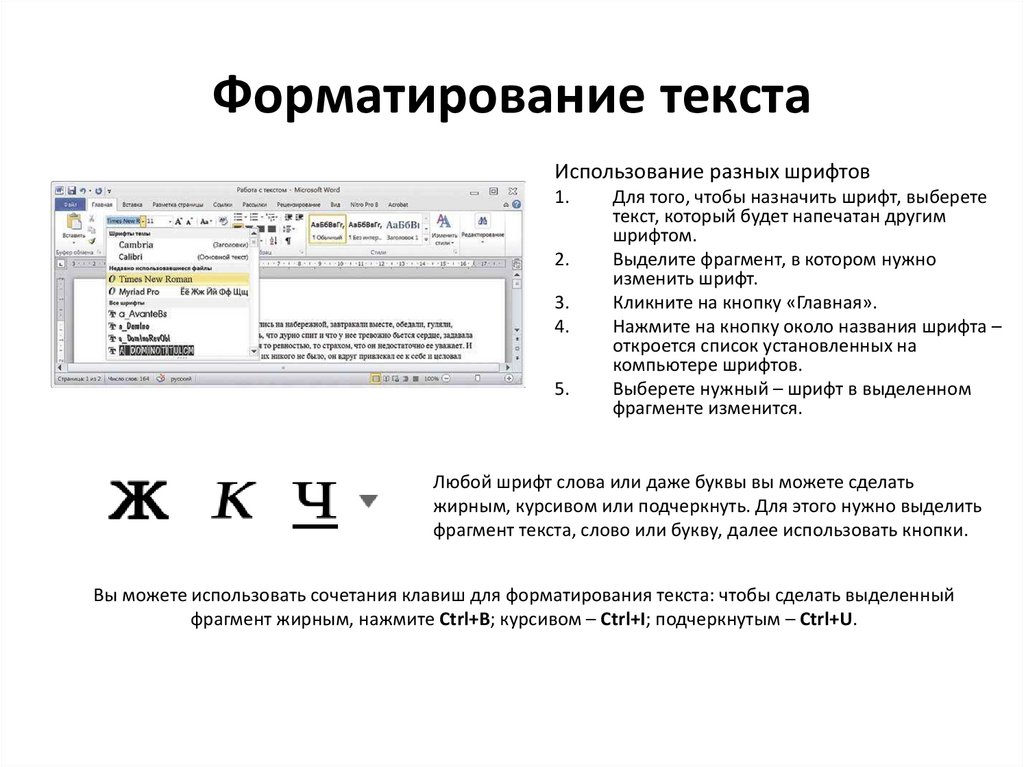 фрагмент жирным, нажмите Ctrl+B; курсивом – Ctrl+I; подчеркнутым – Ctrl+U.