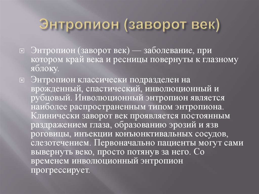 Энтропион (заворот век) — заболевание, прикотором край века и ресницы повернуты к глазному
