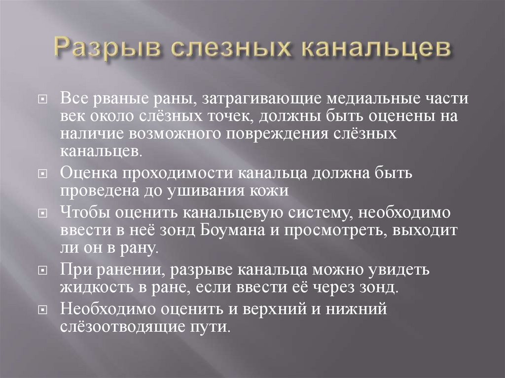 Все рваные раны, затрагивающие медиальные частивек около слёзных точек, должны быть оценены на
