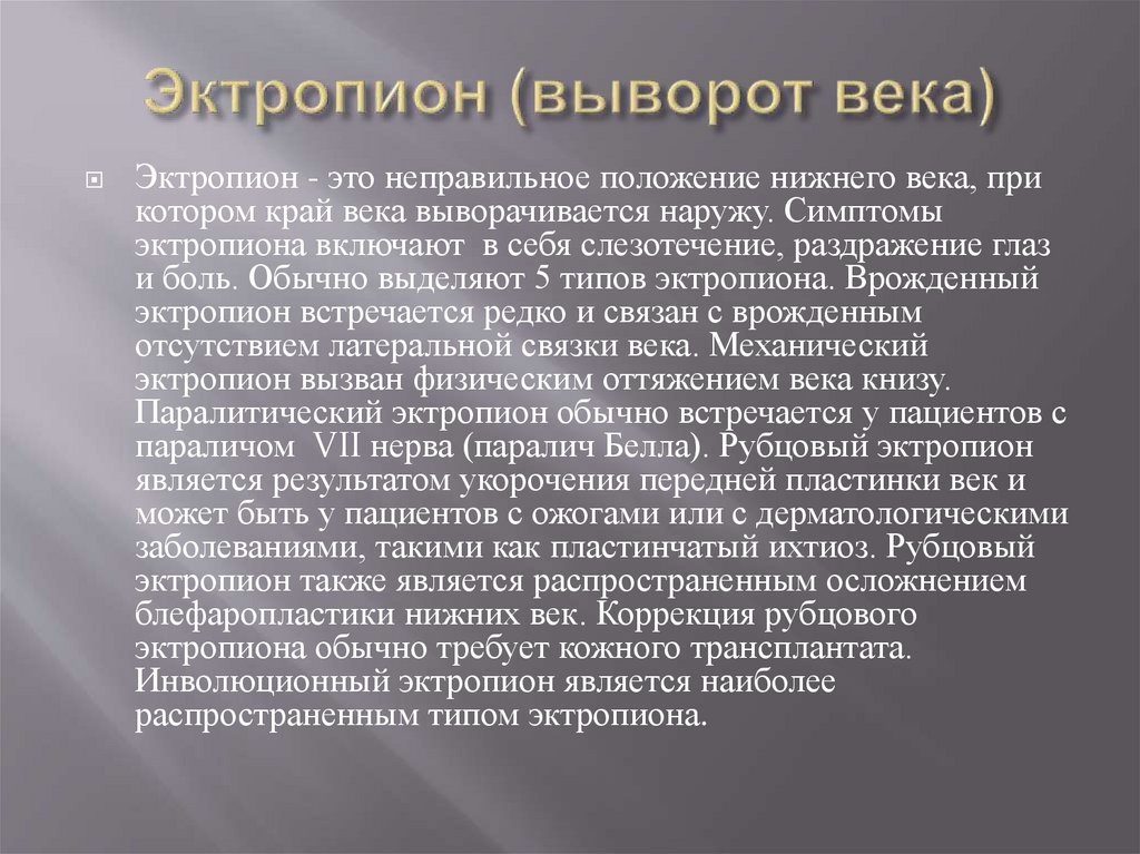 и боль. Обычно выделяют 5 типов эктропиона. Врожденный