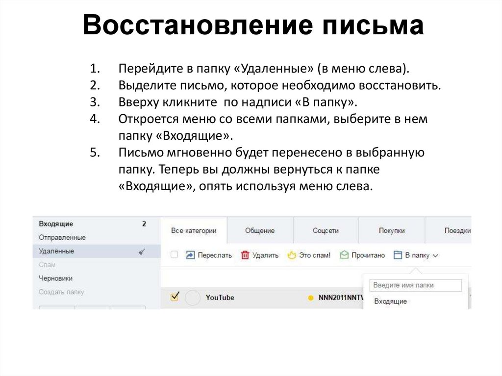 В папке «Удаленные» будут храниться те письма, которые вы удалили из «Входящих».