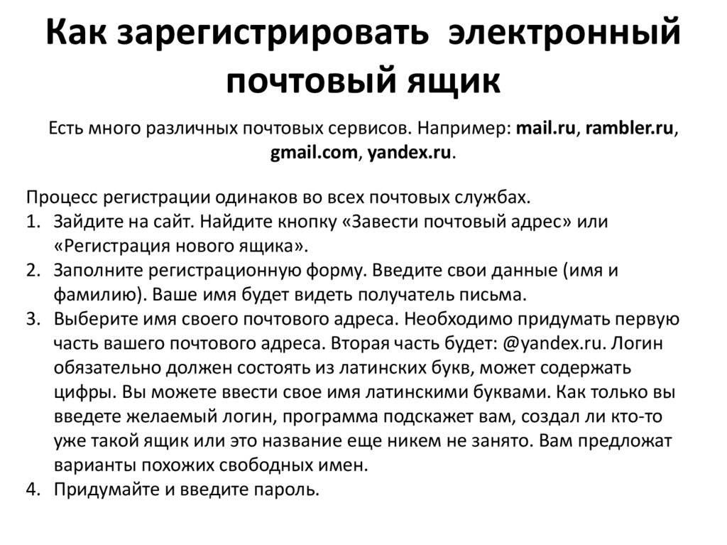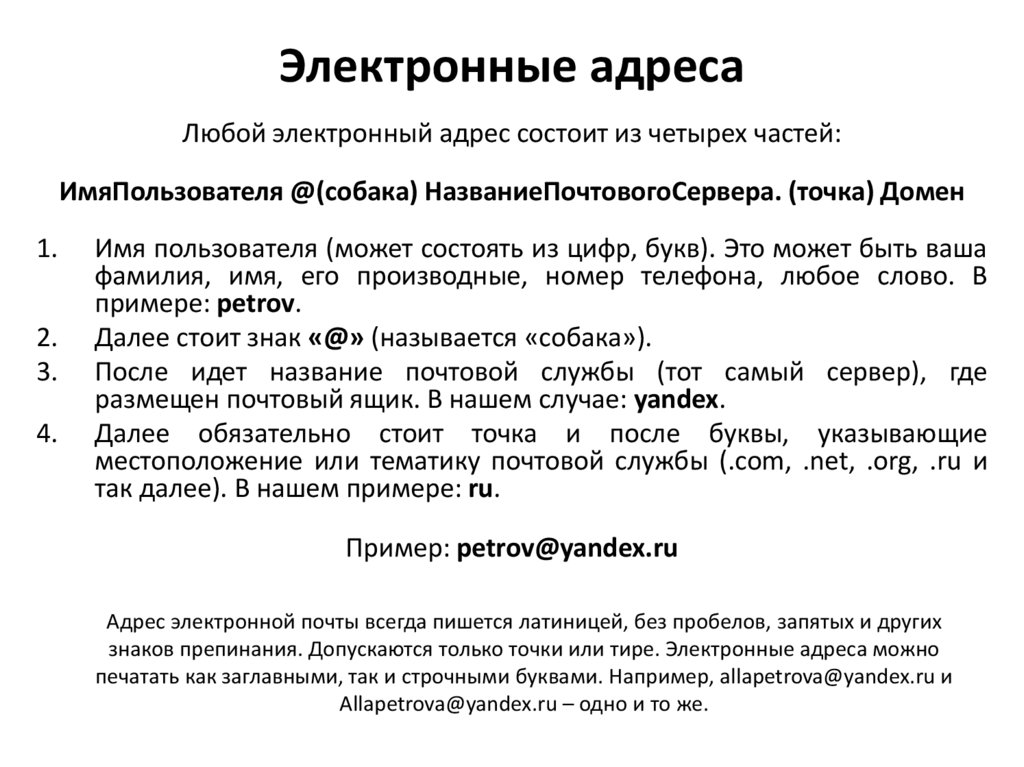 печатать как заглавными, так и строчными буквами. Например, allapetrova@yandex.ru и