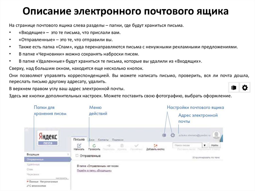 Описание электронного почтового ящикаНа странице почтового ящика слева разделы – папки, где будут храниться письма.