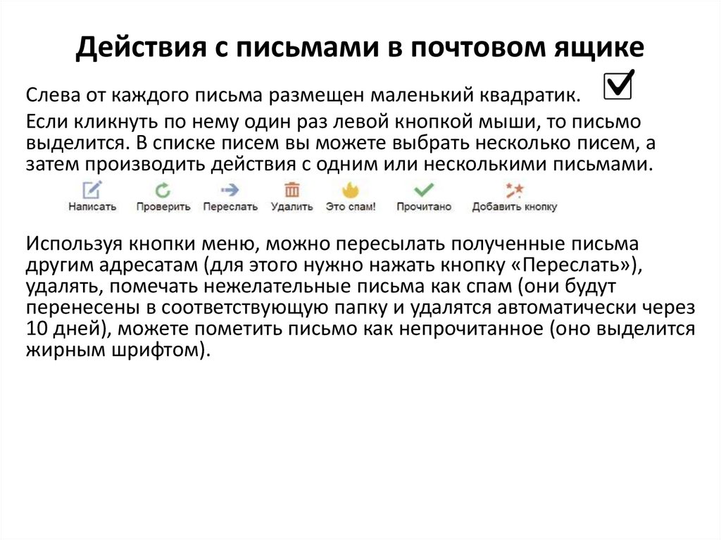 Действия с письмами в почтовом ящикеСлева от каждого письма размещен маленький квадратик.