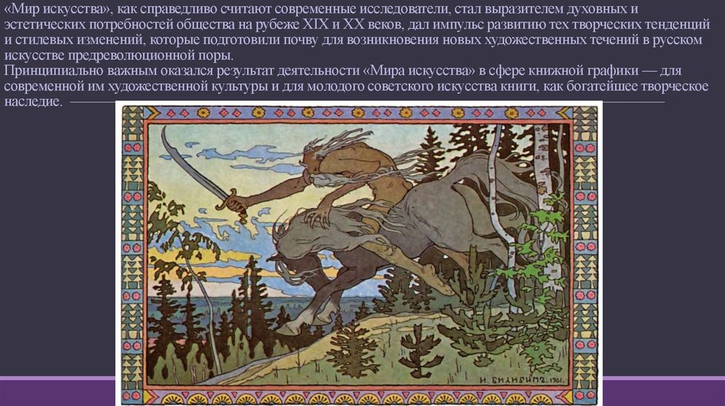 «Мир искусства», как справедливо считают современные исследователи, стал выразителем духовных иэстетических потребностей общества на рубеже ХIХ и ХХ веков, дал импульс развитию тех творческих тенденций