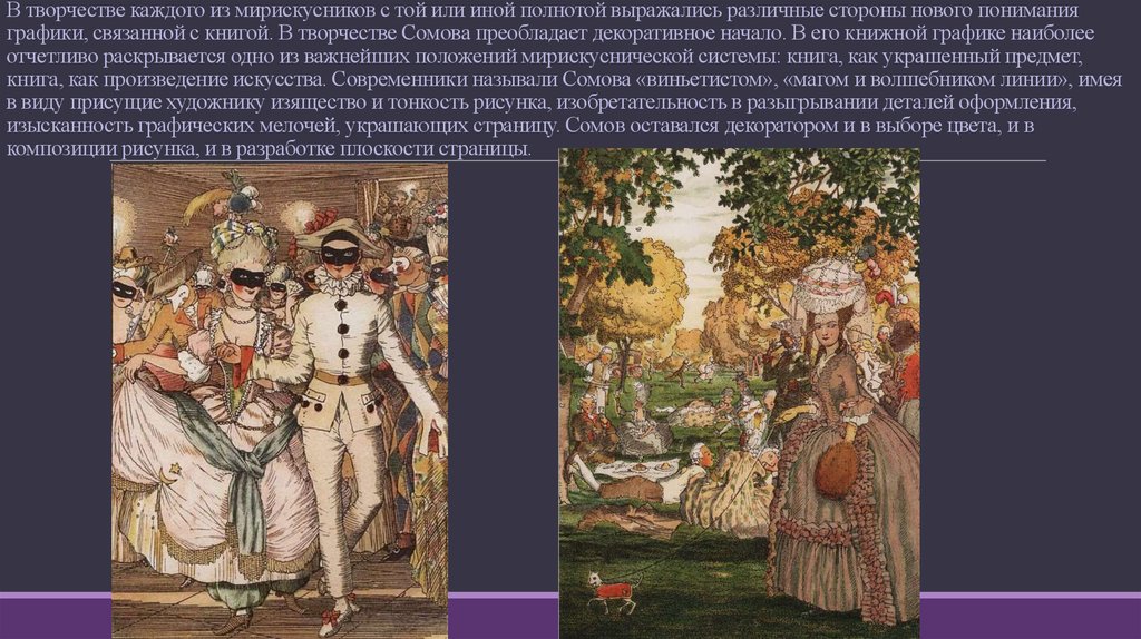 В творчестве каждого из мирискусников с той или иной полнотой выражались различные стороны нового пониманияграфики, связанной с книгой. В творчестве Сомова преобладает декоративное начало. В его книжной графике наиболее