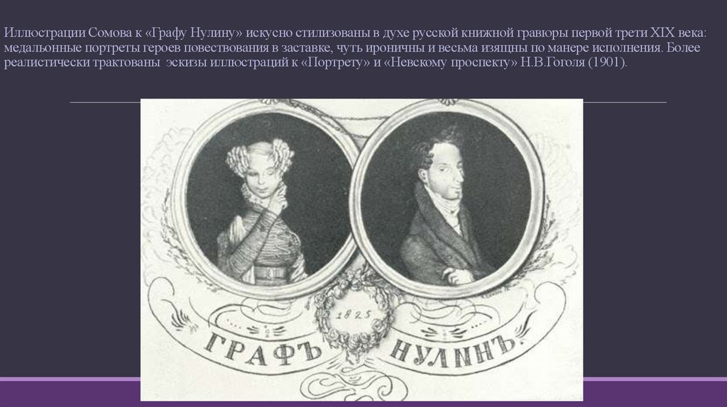Иллюстрации Сомова к «Графу Нулину» искусно стилизованы в духе русской книжной гравюры первой трети XIХ века:медальонные портреты героев повествования в заставке, чуть ироничны и весьма изящны по манере исполнения. Более