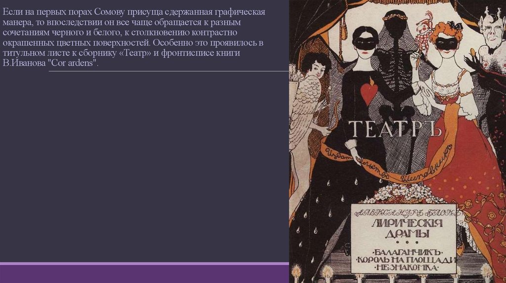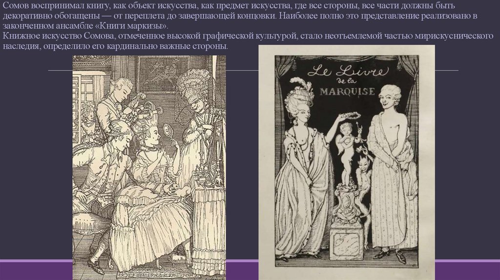 Книжное искусство Сомова, отмеченное высокой графической культурой, стало неотъемлемой частью мирискуснического